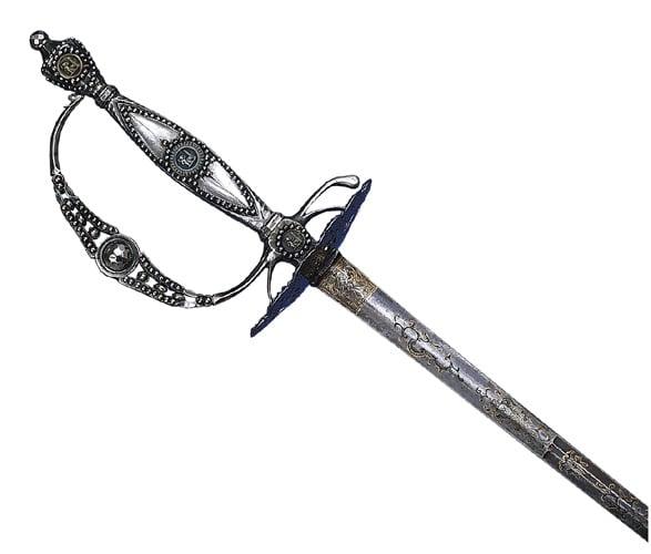 The hilt is of cut steel by Matthew Boulton, and is set with ceramic medallions by Josiah Wedgewood, the blade is probably imported from a Solingen workshop or supplied by a German worker in London.