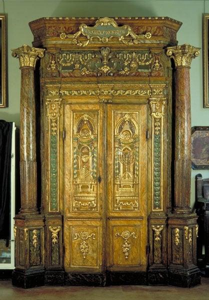 Synagogue ark elaborately carved, coloured and gilded in the Baroque style with Jewish emblems and a Hebrew text in Spanish lettering. Made for the Venetian Ponentine congregation - the Spanish Portuguese refugees from the Inquisition.