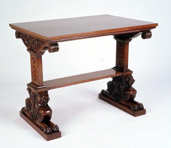 Regency carved centre table designed by Thomas Hope for his home in Duchess Street. Two carved pedestal legs featuring erect palmettes and addorsed creatures support a plain rectangular top. Hope is considered the single most influential figure in the development of the Regency style.