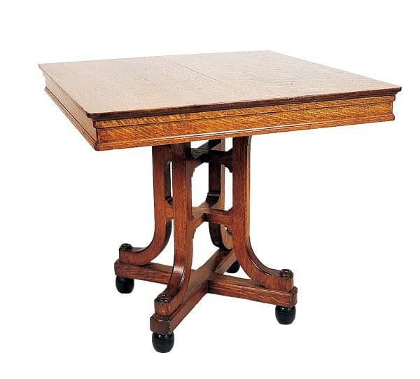 Pugin was one of the most significant architect -designers of the first half of the 19th century, probably best known for his work in designing the interiors and furnishings for the Houses of Parliament. His influence on the Gothic Revival, on John Ruskin and William Morris, and on the next generation of architects was crucial to the development of the Arts and Crafts Movement at the turn of the last century. Pugin's approach to furniture design marks the beginning of the late 19th- and 20th-century concept of 'fitness for purpose'. The straightforward, undecorated lines of this table, developed from Tudor and Jacobean models, were influential on Arts and Crafts Movement designers.
