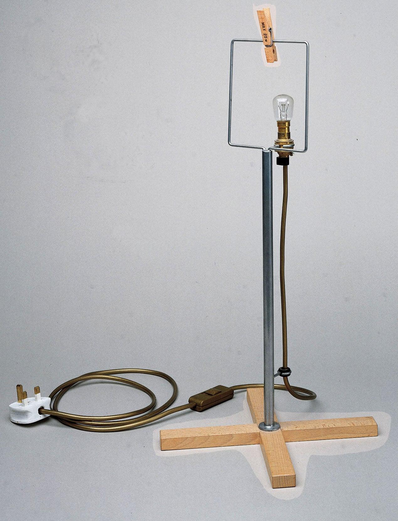 There is something almost philosophical about Michael Marriott's lamps, as though Wittgenstein had gone shopping for timber and electrical components. The shades are the one quirky feature: for the standard lamp, a sheet torn from an old masonic ledger; for the table lamp, you attach a postcard of your choice to the clothes peg provided. Part of a group of three gifts to five museums by Marina Vaizey through the Art Fund between 1995 and 2003.
