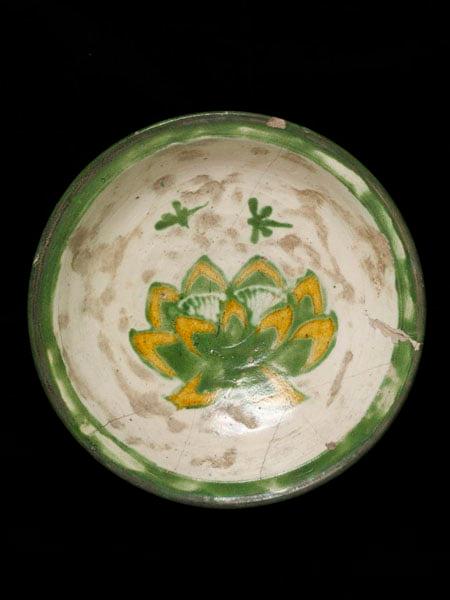 Earthenware bowl, painted with a lotus-flower in green and orange-yellow.T'ang dynasty.