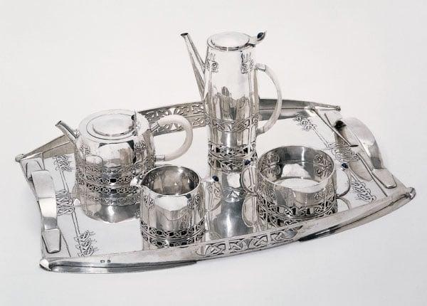 Service consists of tray; two pots, one tall and one stout; milk jug; and sugar bowl. The service is amongst the most accomplished and ambitious of Knox's designs. It was made by W H Haseler Ltd of Birmingham, one of the most important and progressive silver manufactureres of the early 20th century.
