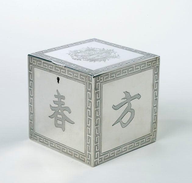 The canister is in the form known at the time as a ‘tea tub’ and was based on the tea chests imported from China which can be seen in trade cards and other contemporary illustrations. The pretence was further enhanced by the use of Chinese calligraphic characters on the sides and the fret pattern of the borders. Chinoiserie objects in all materials (furniture, ceramics, metalwork and textiles) represent a crucial phase in the development of English taste during the 17th to the 19th centuries.