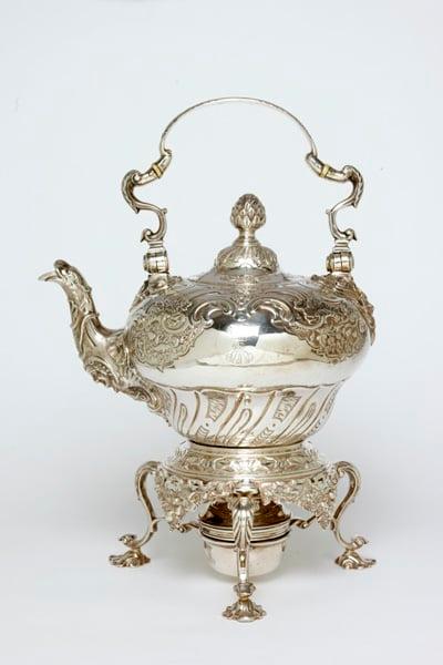 Following her previous generous gifts to various UK public collections through the Art Fund, Joan Hurst has donated several more pieces from her extensive and varied collection. Ornate silver tea kettle on a stand, an early example of 18th-century English Rococo design.