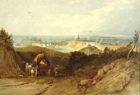 A view of Tenby from the hill overlooking the sea with a rough country road in the foreground. There is a covered four-wheeled wagon drawn by three horses one behind the other proceeding down hill. At the back we can see a man and boy on the roadway with the man carrying a long whip.