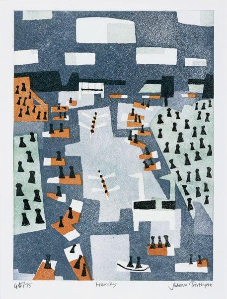 The Thames Suite shows 12 different views of the River Thames from the upper non-tidal reaches to the tidal stretches of London and down to the Estuary. They depict the varied and rich character of the river and the human activities which occur alongside it, through a fresh, innovative and modern approach.