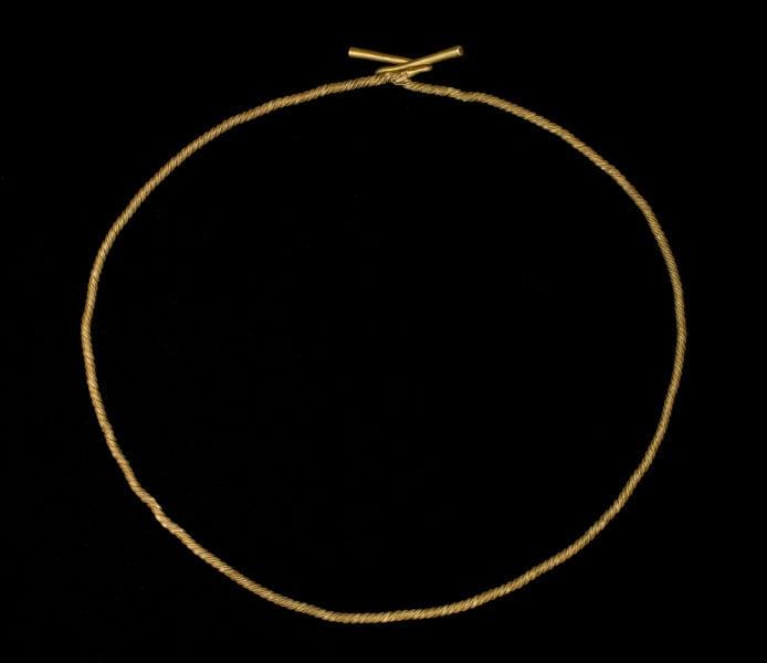 Tara type torc made of strips soldered together to form a cruciform section: the terminals have been solderd on. Diam, 37 cm, Weight, 237 grams. Tara type is characteristic of Late Middle Bronze Age and is of Irish origin.