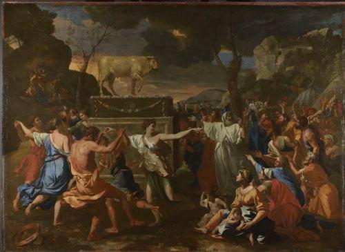In the centre is a golden calf with figures dancing around it. Aaron invites the people to worship while Moses descends the mountain and lifts a tablet above his head.
