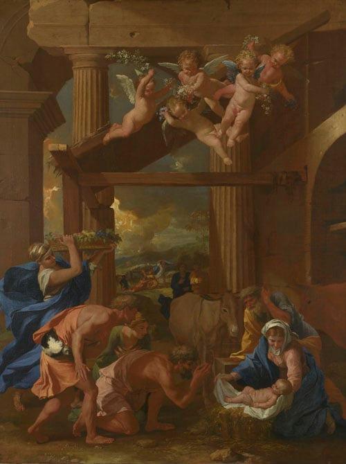 In the foreground the Holy Family is adored by shepherds and shepherdesses, while in front of the roof of the stable are five cherubs. The earlier moment in the story when the angel appears to the shepherds to announce the birth of Christ is depicted in the background. The picture is almost unique among Poussin's works for its extraordinary delicacy of execution and its immaculate preservation. The painting was probably executed when Poussin, though still influenced by the Venetians in his colouring, was moving towards that concentration and simplicity of style which characterise the classical paintings of the 1640s.