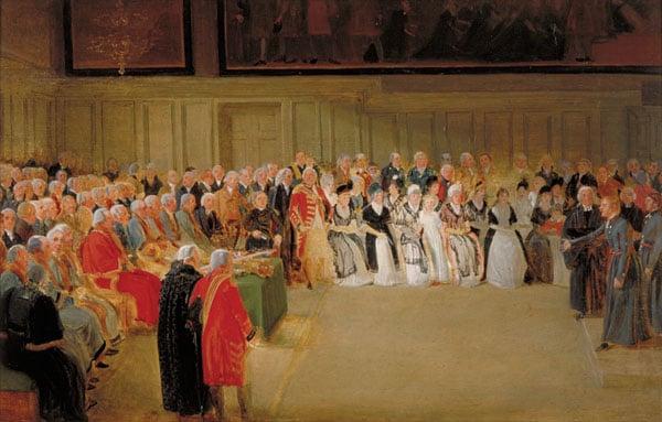 'The Annual orations in the Great Hall at Christs Hospital on St Mathew's Day' Two scholars from the Grammar School deliver their speeches.