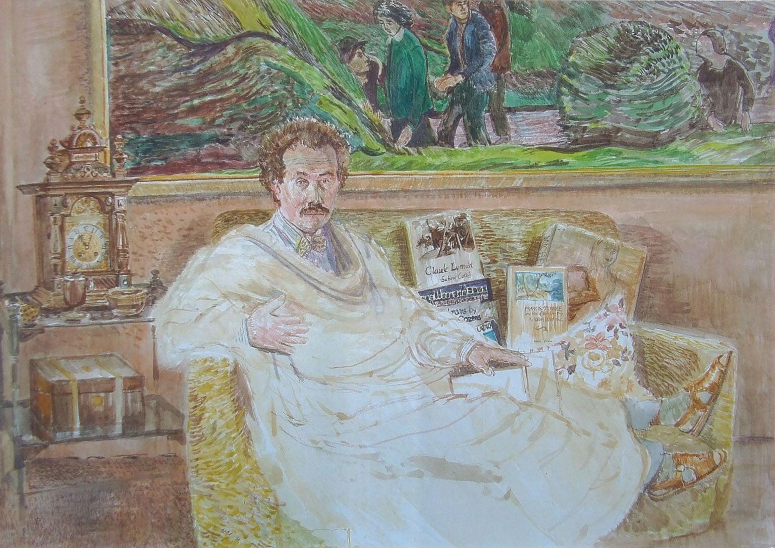 This self portrait was painted during the artist's presidency of the Royal Watercolour Society, and captures the essence of his own 'Grand Tour' to Italy in the 1970s. The counterpane worn by the artist borrows from the robe in Tischbein's 'Goethe in the Roman Campagna' (1786), and the artist also includes books on other artists that were influential on his practice at the time. The watercolour compliments a larger collection of works by Maurice Sheppard already in the library's collection.