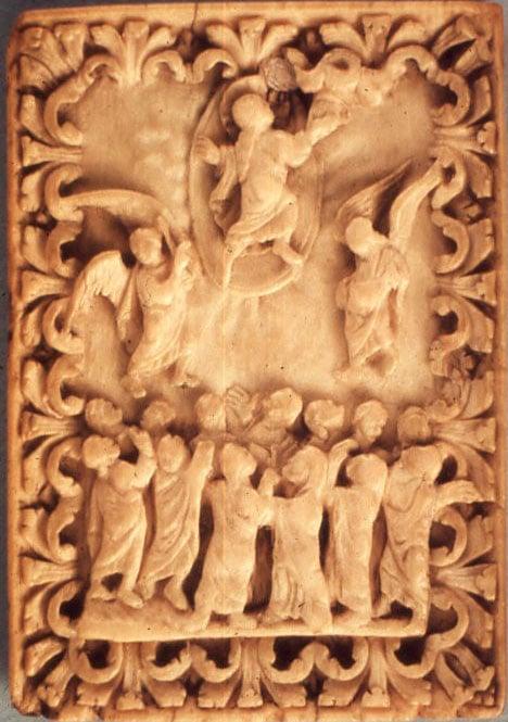 Plaque closely related to the 'Liuthard' group of ivories (which decorated the covers of manuscripts) made for the grandson of Charlemagne, Charles the Bald. Group depends, both in style and iconography, on the Utrecht Psalter from the early 9th century, under Charles's father, Louis the Pious.