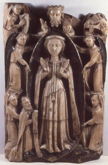 The figure of the Virgin is contained within a mandorla supported by angels. St. Thomas is kneeling at the lower left holding the Virgin's girdle, God the Father in benediction is above, flanked by angels playing a harp and a lute. The alabaster was originally coloured and a large proportion of the paint survives.