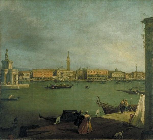 This early work presents a view of the Dogana, the entrance to the Grand Canal, the Molo, and Riva degli Schiavoni, with St Mark's in the background. The picture was painted from the point of the Giudecca, showing, in the foreground, part of the Fondaco di S. Giovanni with figures and boats.
