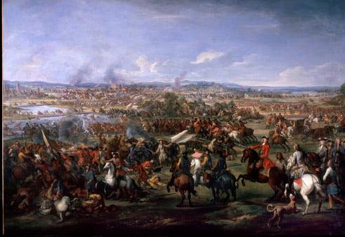 This fascinating picture represents the final phase of the battle. Marlborough and Prince Eugene had taken the French commanders by surprise at Blenheim (shown in the centre of the picture). Although the French position was strongly fortified, Marlborough opened a vigorous attack, and, after heavy fighting, was able to launch a general assault. Despite severe losses, he gained one of the greatest victories in English military history. Marlborough himself is seen on the right, sword in hand on a bay charger, surrounded by his staff, while behind him the defeated French Marshal, Tallard, is being driven off the battlefield in Marlborough's coach.