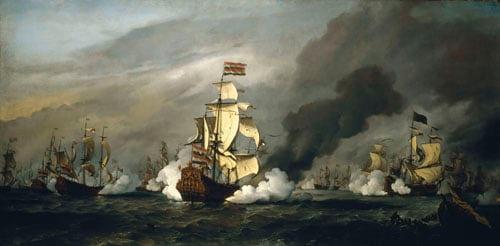 The battle of Texel was fought on 11 August 1673, the last great battle against the Dutch in the 17th century. Considered the finest sea-piece by Van de Velde; it shows the battle between the 'Gouden Leeuw' and the 'Royal Prince'.