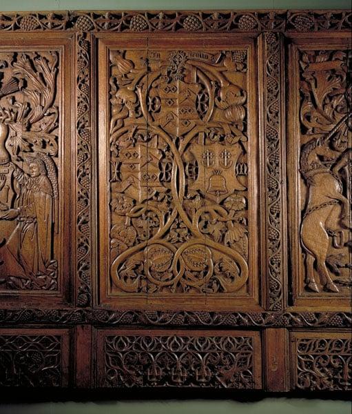 The Beaton Panels. Eight panels showing; the Annunciation; Tree of Jesse; Arma Christi; Arms of Cardinal Beaton & his parents; Royal Arms of Scotland; a group of armorial bosses of Cardinal & Beaton family members, & two panels of fruit & flowers.