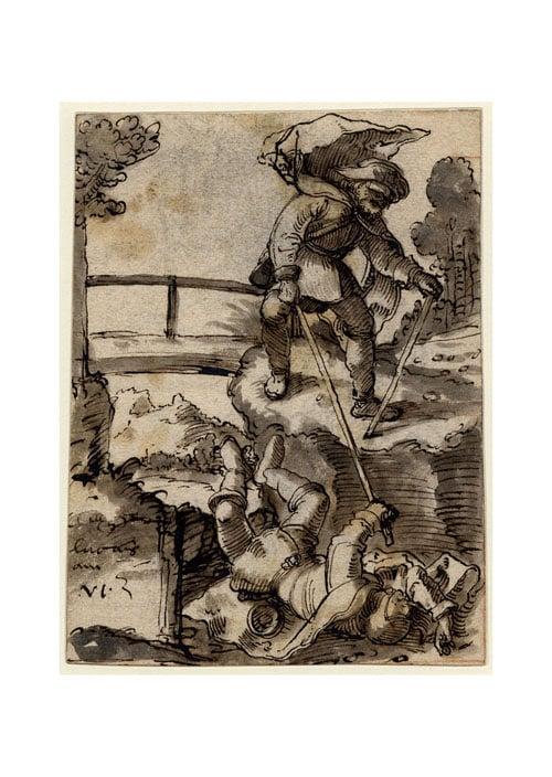 A man lying in a ditch guides another man. This is one of 111 drawings bequeathed to the British Museum by Rosi Schilling in 1997. The majority of this collection of drawings formed by Dr Edmund Schilling was bequeathed to the British Museum through the Art Fund by his widow, Mrs Rosi Schilling, in 1993. Schilling was a former curator of the Stadelsches Kunstinstitut in Frankfurt, who emigrated to England in 1937. He was one of the few acknowledged specialists in this country on German graphic art, and built up his collection during the 1940s and 1950s in London when, Northern drawings were unfashionable and could be bought relatively inexpensively. His collection included drawings by major artists such as Hans Baldung and Lucas Cranach.