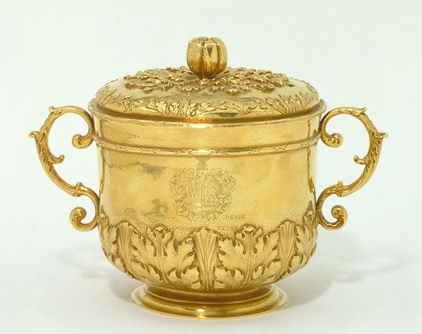 One of only 8 surviving two-handled cups in gold from the reign of Charles II and appears to be the earliest example of a race prize cup. The cup bears the arms and crest of Sir William Bowes of Streatlam, and his wife Elizabeth Blakiston of Gibside.