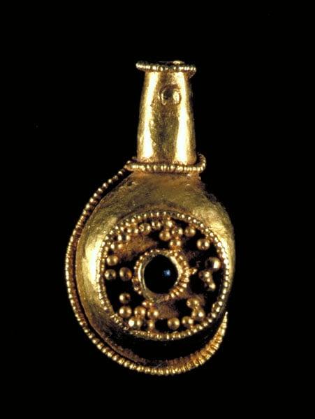 Gold jewel of domed circular section decorated with beaded wire, centred by a blue glass cabochon stone, tapering short socket terminating in similar beadwork. The narrow socket would have held an ivory or wood rod or pointer. The Bowleaze Jewel's association with the court workshops of Alfred the Great is very likely.