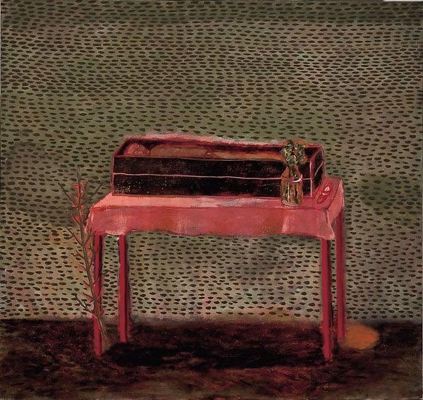 Table in the centre of the picture. A child lies in a coffin like structure or box on the table. There is a posy of flowers and a child's shoe on the table and on the ground beside the table leg is a branch from a tree.