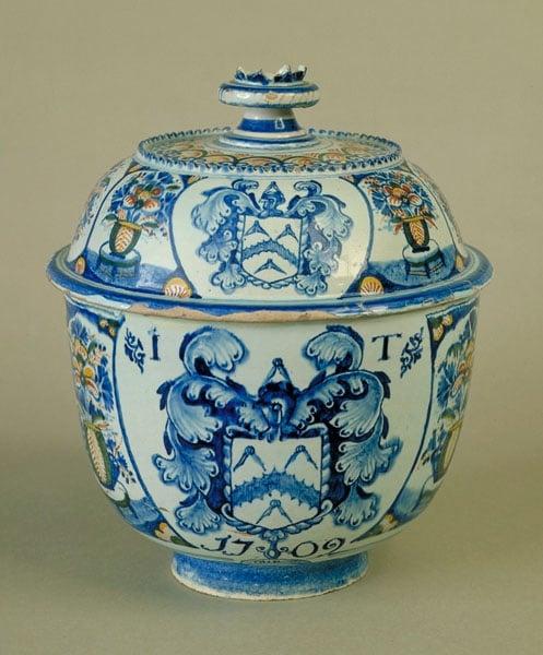 Also known as the Carpenter's Arms Bowl. The bowl and cover of Bristol delft or tin enamelled ware. Decorated in polychrome with vases and flowers, the arms and motto of the Carpenters Company, the initials IT and the date 1709. Inside painting of a man beside a river.
