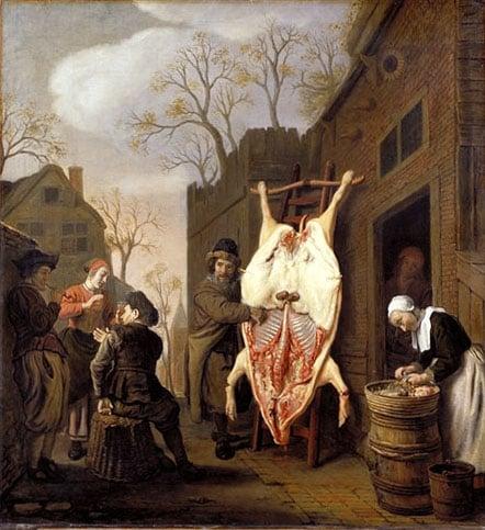 The scene in this painting takes place before a butcher's shop. To the left, a group of gentlemen sit around drinking while an old woman prepares shellfish to the right. This painting was part of a collection of 117 works belonging to the industrialist and engineer F.D. Lycett Green and bequeathed to York through the Art Fund, in 1955, in recognition of the remarkable efforts made after the Second World War by its curator to transform it into a gallery of international importance.
