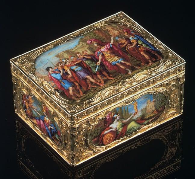 Presentation snuff-box. The cover, sides and base inset with enamel panels & containing an enamel miniature of George, Prince of Wales, later King George III. This work was acquired with assistance from the Wolfson Foundation.