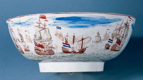 A bowl depicting on one side the Battle of Camperdown in progress and on the other a scene of the cutter 'Active' bringing the news of the Dutch fleet being at sea to Admiral Duncan in the Yarnouth Roads. The Battle, which took place in 1797, was a famous victory over the Dutch navy by Admiral Duncan who had been appointed Commander of the North Sea Fleet two years earlier. This decoration is attributed to Robert Allen who was responsible for the majority of the best decoration found on Lowestoft porcelain and particularly for important landscape and maritime scenes from the later period of the factory. The interior of the bowl is painted with a floral design.