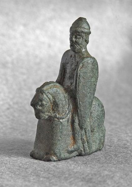 A very rare and beautiful 12th-century bronze figurine of a knight equipped for battle. The knight holds a kite-shaped shield in his right hand and the horse's reins in his left. He wears a conical helmet and surcoat, and the horse has a bridle, saddle cloth and caparison. Although images of the knight proliferate in this period, representations of equestrian knights in the round are rare and this piece provides an evocative insight into Medieval culture. Its exact function is unknown although it may have been made as decoration for a larger object.