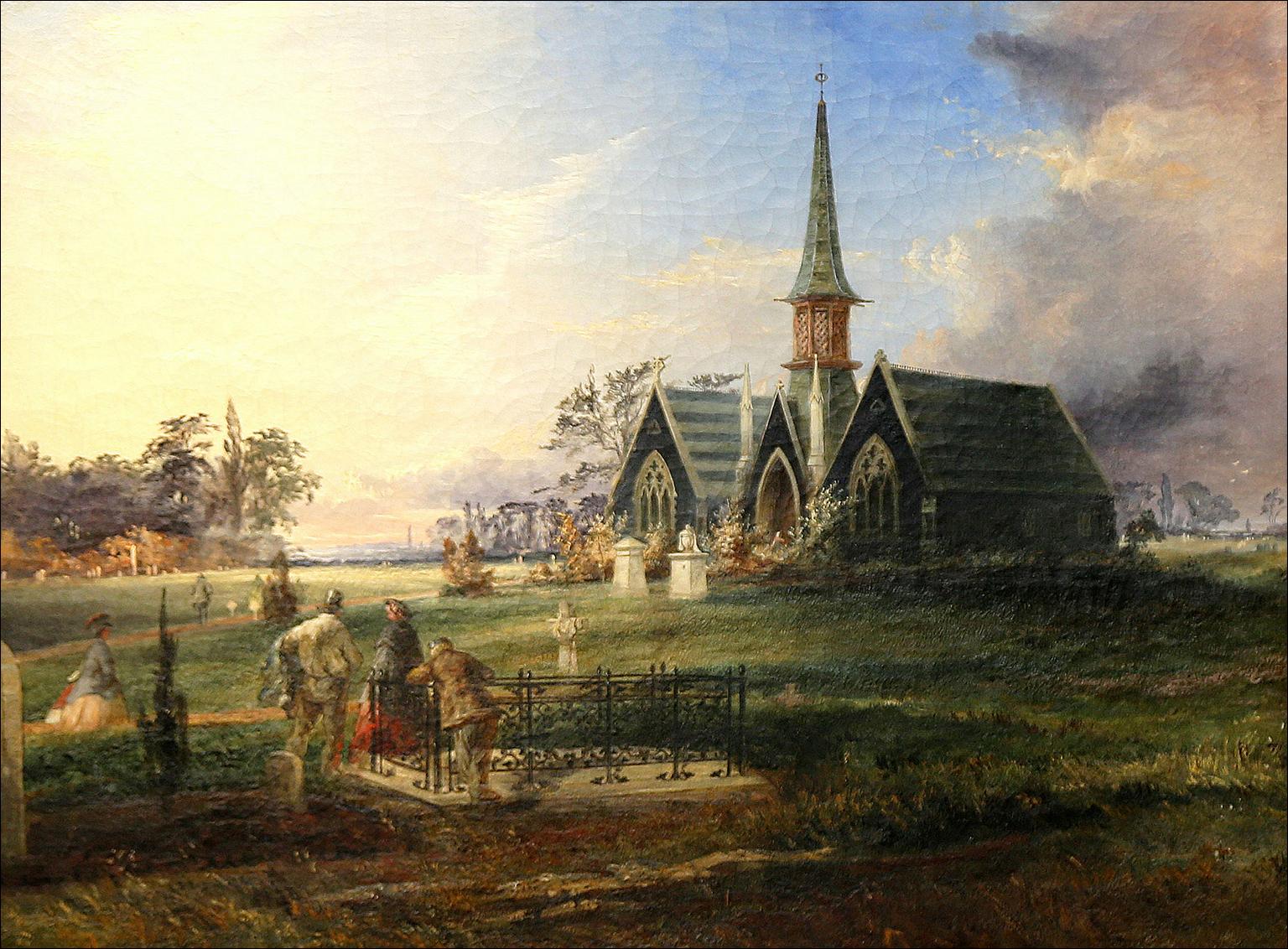 This painting by Henry Baines shows the newly completed pair of chapels (one Anglican, one Nonconformist) at Hardwick Road Cemetery, King’s Lynn, around 1856. The chapels were built in flint and stone and designed by the London architects Aickin and Capes. They were demolished in 1972.