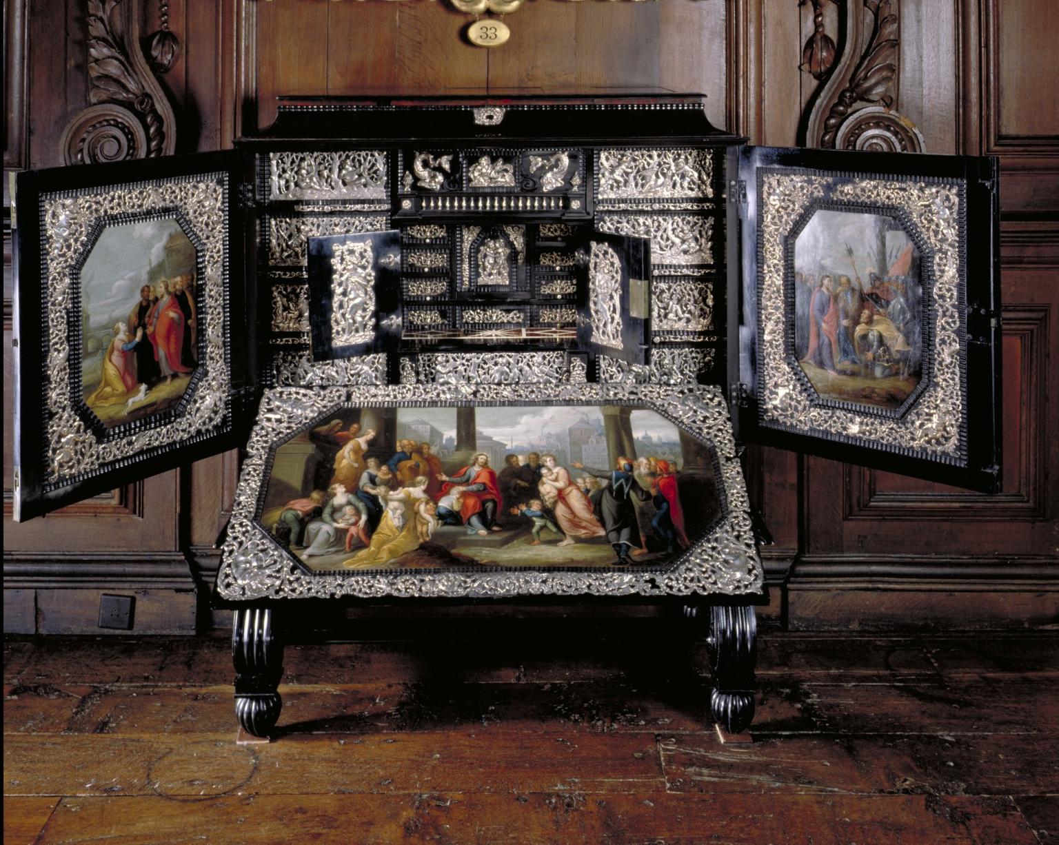 The cabinet has a drop-front decorated with filigree-like silver and elaborate silver mounts.The interior and exterior are set with paintings on copper. The main scenes are 'Christ and the Canaanite Woman', 'Sinite Parvulos' and 'Christ and the Centurion'.