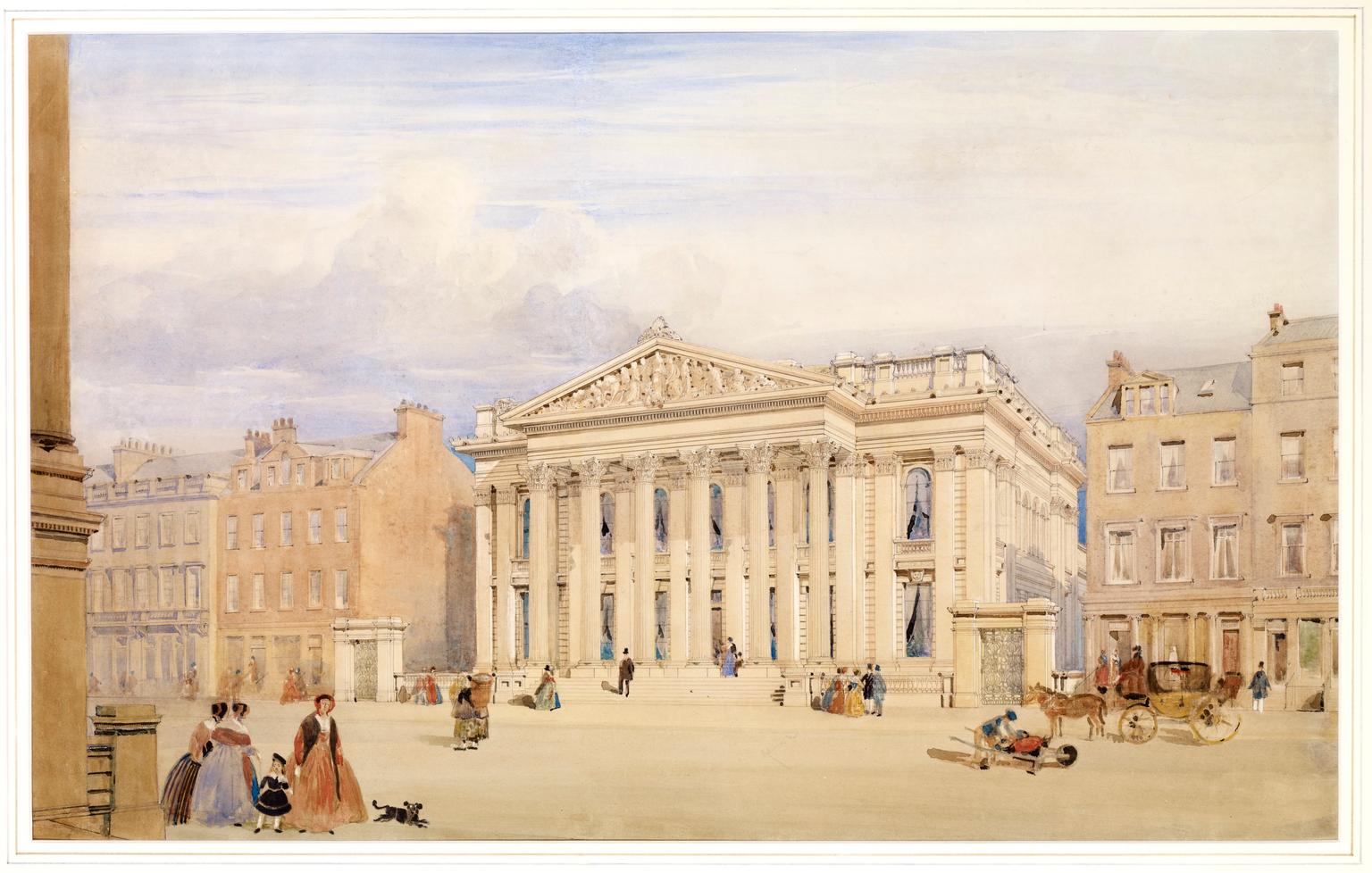 Showing Rhind's neoclassical design for the head office of Edinburgh's Commercial Bank, this fine watercolour is a particularly strong example of the perspectivist's art in the mid-19th century.