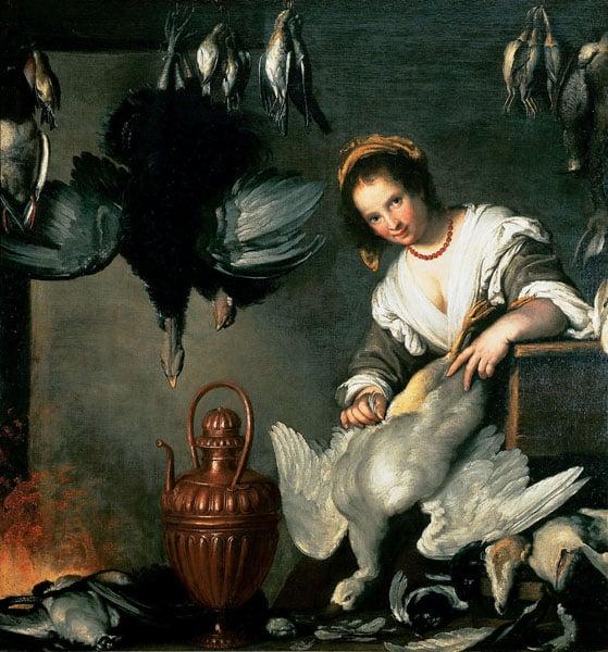 Depicts woman seated at table, plucking feathers from a swan laying across her lap. Other game hangs from the ceiling and lies next to her on the floor. The only known variant of one of the seminal genre pictures of the seventeenth century, Strozzi's 'Cuoca' (Cook) in the collection of the Palazzo Rosso, Genoa.