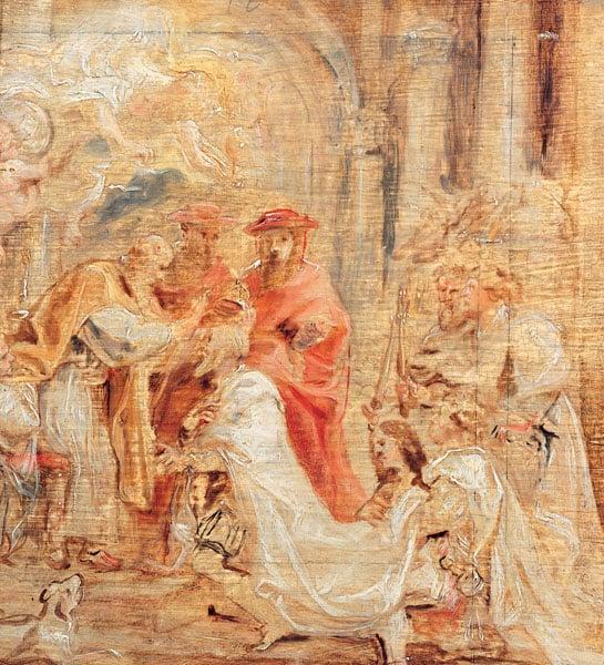The King, attended by two pages, kneels before the bishop of Chartres who places the crown upon his head. Behind him stand two cardinals, while two secular attendants, holding the 'main-de-justice; and the sceptre, wait on the right. A study for an unexecuted commission to produce a companion series to the series on Marie De Medici's life.