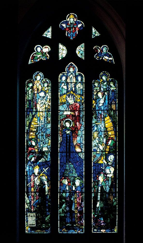 A triple stained glass window which depicts the Virgin being crowned by God the Son as a central figure. She is clothed in an emerald robe and a vibrant ultramarine blue cloak, and is surrounded by a shimmering cloud. Above the Virgin are SS John and Luke and God the Father, with angels in adoration.