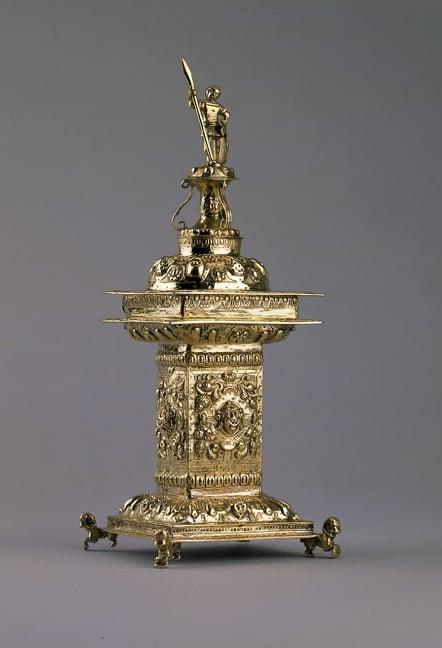 Pillar salt in three sections, decorated with strapwork, fruit, flowers and grotesque masks. The finial is formed as a warrior and the four feet as horses. Hallmark on all 3 parts London 1584-5, makers mark a jug, unidentified.