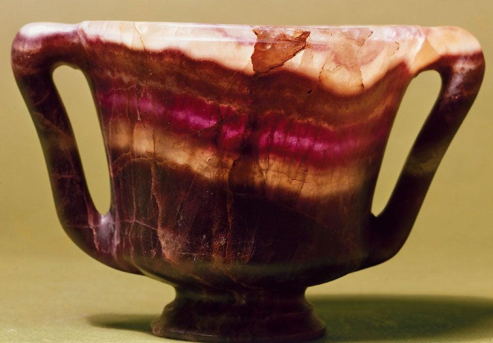 This two handled 'Kanthros' type drinking cup is horizontally banded in shades of purple and white and appears at its most exquisite when light passes through it. Finding pieces of murra large enough to carve was very difficult and extremely expensive. This cup is made from a relatively rare and valuable mineral, fluorspar, which was prized in Roman times for its banded appearance and the special flavour which it gave to wine drunk from it. In Roman times, the mineral could only be found in Parthia, modern day Iran. According to Pliny, fluorspar vessels were first brought to Rome by Pompey the Great in 62-61 BC after his victories in the East. Fluorspar has been employed in more recent times for ornamental purposes using Derbyshire fluorspar, known as blue John. Few such cups have survived from antiquity. It was presented to the British Museum in commemoration of Lord Crawford's 25 years as Chairman of the Art Fund.