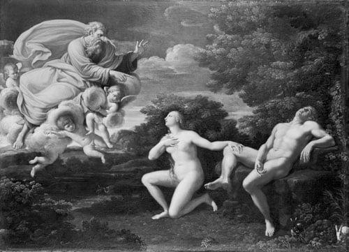 On the right, the figures of Adam and Eve; above and to the left, God the Father supported by cherubs. Formerly attributed to Angelo Trevisani.