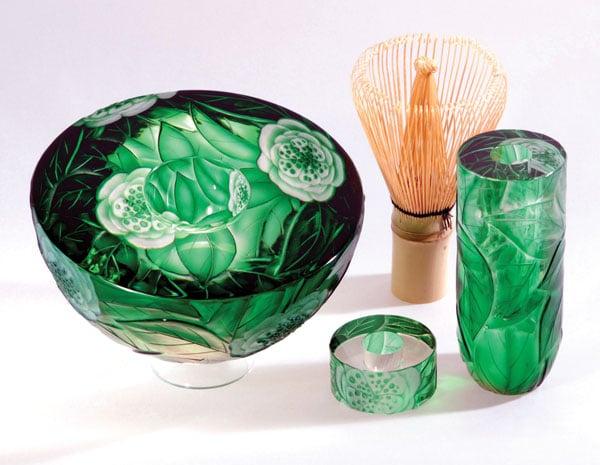 This work consists of three items used in a Japanese tea ceremony, together with a bamboo tea whisk. The three-dimensional engraving and the superimposed green and clear layers of glass suggest the flowers are floating in a bowl of liquid. From certain angles a smaller bowl appears refracted in the centre. The optical illusion hints at the story behind the work which was the artist's response to the predicament of the present Crown Princess of Japan. On closer inspection, the tea bowl is un-useable because it is almost solid. The princess has an ambiguous status within the royal family because she bore a daughter instead of a son. Here the un-useable tea bowl symbolises her ostracism from daily social rituals. The smaller bowl glimpsed inside the real one refers to the princessÂ’s daughter.