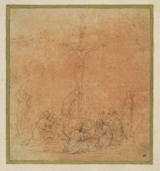 The Crucifixion with nine Saints present:St Jerome, St John, Mary Magdalene etc. Fine pen and ink over a preliminary sketch in lead point (?) on coloured paper.