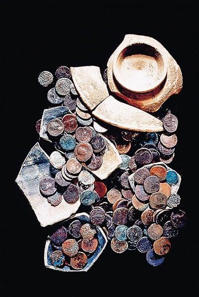 421 Roman coins with a broken greyware pot and a Samian bowl used as a lid.