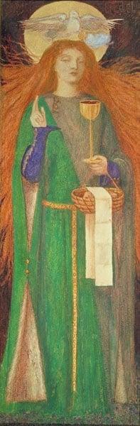 The standing figure of an angel with spreading red-gold hair, robed in green with a shot green and pink overdress, holds a long-stemmed cup and a basket, with a folded white napkin in her hand. The holy dove above her bears a censer in its beak.