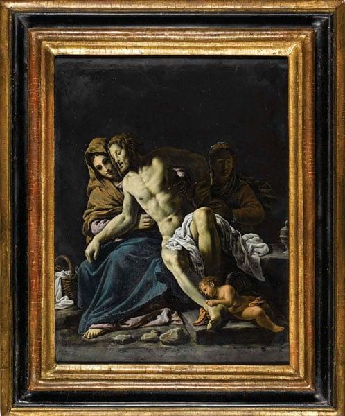 This is a rare painting on slate and the first work in this medium to enter the Fitzwilliam's collection. Bassetti was born in Verona and painting on slate was a speciality of Verona at this time. The gleaming dark background was well suited to dramatically lit nocturnal scenes. In this example the subtle lighting of the figures surrounded by darkness concentrates the viewer's eye on the image. The iconography is unusual. The awkward position of Christ's body falling into the Virgin's lap has a dynamic quality that heightens the tension in a subject which is usually static. The winged angel holding Christ's foot helps the balance of the composition, but he also appears to cleanse the blood from Christ's wound with the drapery he holds in his right hand. The Fitzwilliam has an active policy of extending its important collection of Italian paintings.