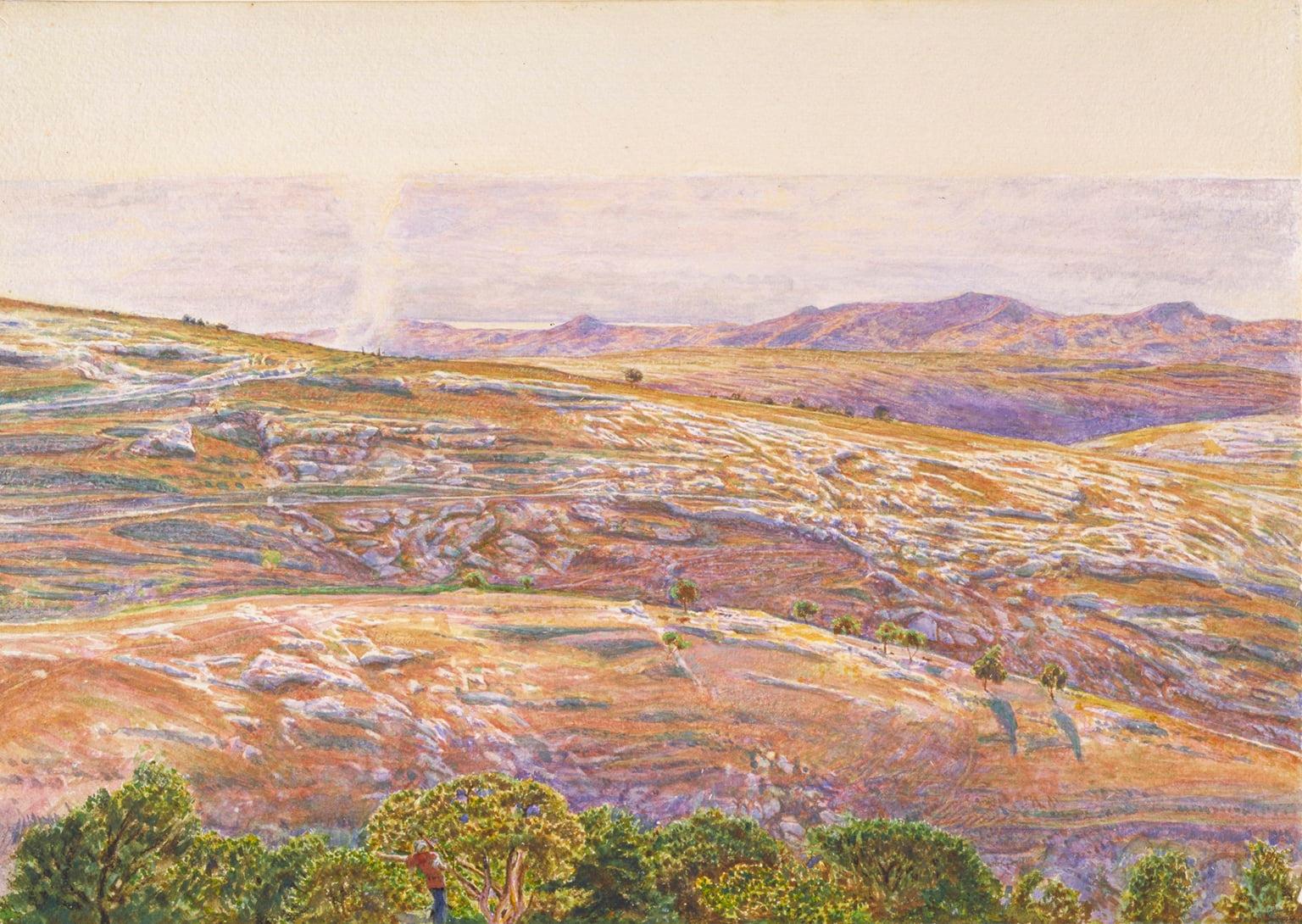 A typical detailed study made in the Holy Land depicting a view from the Mount of Offence, looking towards the Dead Sea and the Mountains of Moab - morning. Hunt appears to have begun this watercolour around Sept 1854 as indicated in a letter to Thomas Combe: 'Tomorrow morning I am to rise ere the sun to go out to finish a sketch which I commenced on the Mount of Offence...last year about this time'. Today the Mount of Offence is identified with the southern and lowest peak of the Mount of Olives, to the south-east of Jerusalem.