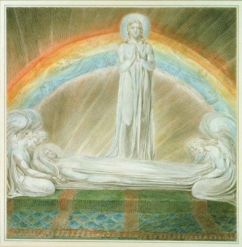 The body of the Virgin lies on a dais with two angels kneeling at her head and at her feet. St John stands over her in prayer, and behind is a rainbow filled with winged heads of angels, as in the companion picture of 'The Death of St Joseph'. This watercolour is part of a collection of works by William Blake belonging to the late Graham Robertson and was included in his sale at Christie's in 1949. Graham Robertson, painter, author and theatrical designer, was widely known as a Blake collector. At his death in 1948 he bequeathed 4 Blakes to the Nation; the rest of the collection was to be disposed of by auction. He had, however, left a very considerable estate to be given to charities. This allowed his Executors to instruct the auctioneers that some of the drawings should be acquired for certain museums up to defined limits. In this way 20 works, totalling £40,281 were given by the Executors, through the Art Fund, to 6 public collections.