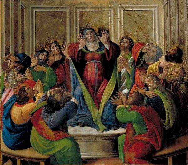 An altarpiece showing the Virgin Mary standing, on a pedestal against an architectural background, in the centre of the Apostles who are grouped around her in a circle. The Holy Ghost is in the form of a dove above her. Undergone considerable restoration. Completed by assistants.