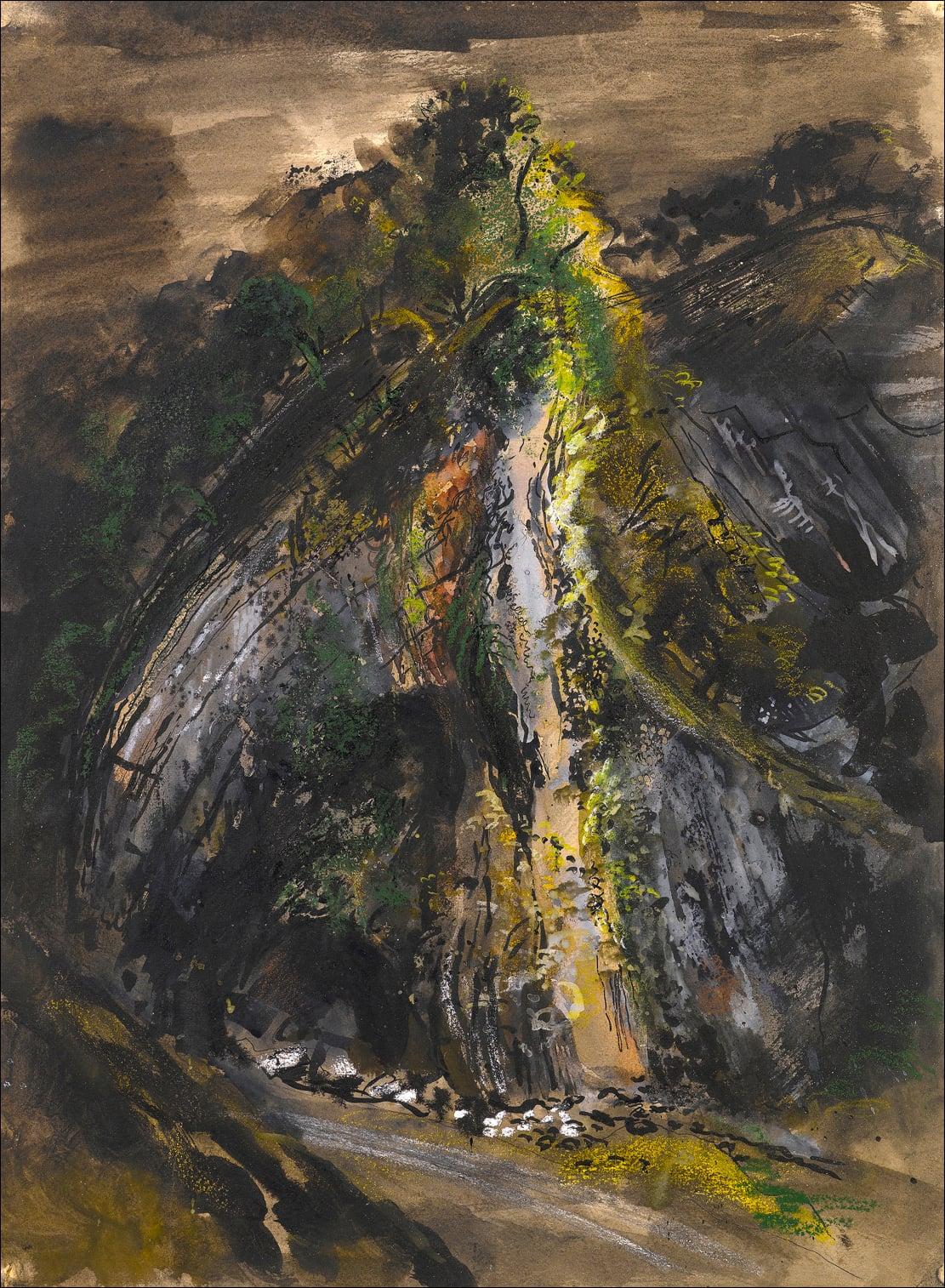 This romantic scene – officially titled The Devil’s Bridge Waterfall – has recently been identified by the Brecknock Museum as a study of Bwa Maen, a sublime limestone formation in the Vale of Neath, Powys, South Wales. John Piper visited the area in 1942 with Geoffrey Grigson, and took a keen interest in the history of artists who had travelled there in the 18th and 19th centuries. Piper’s picture now makes a handsome addition to Brecknock Museum’s art collection, which focuses on works created in or inspired by the dramatic scenery of the Brecon Beacons from the 18th century to the present day.