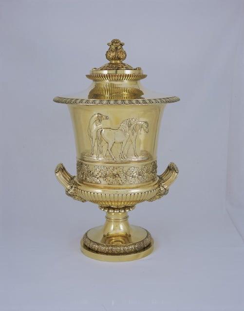 Covered wine-cooler with 2 low-set handles with mask terminals. Decorated with a chased relief of 3 horses above a cast arabesque of oak leaves and acorns. The cover has a foliated knop. Inscribed; 'Won by Mr Thos. Houldsworth's Filho da Puta, 4 yrs. carrying 7 stone 7 pounds, 4 miles, Doncaster, 25th September,1816'. Designed by John Flaxman and made by Paul Storr at the London silversmiths, Rundell Bridge and Rundell.